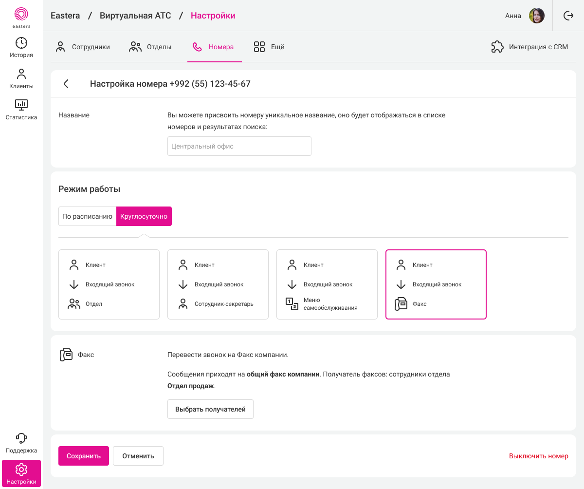 Чтобы подключить к отдельному номеру на постоянной основе, перейдите в раздел «Номера». Выберите режим работы «Круглосуточно» и настройте один из номеров для работы с факсом.