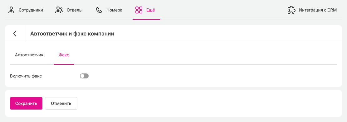 Чтобы посмотреть настройки всех факсов компании, перейдите в «Настройки» – «Еще» – «Автоответчик и факс компании» – вкладка «Факс».