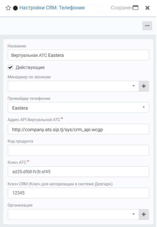• Ключ CRM (Ключ для авторизации в системе Девпарк): ранее придуманный пароль, который вы указали в ВАТС в поле «Ключ для авторизации в вашей CRM».