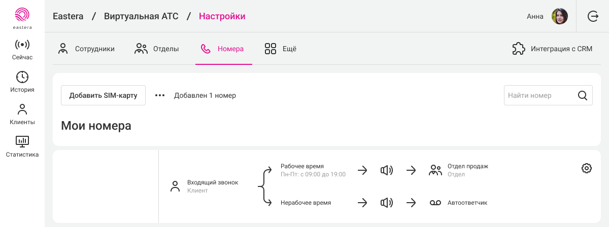 • Провайдер телефонии: Виртуальная АТС Eastera.