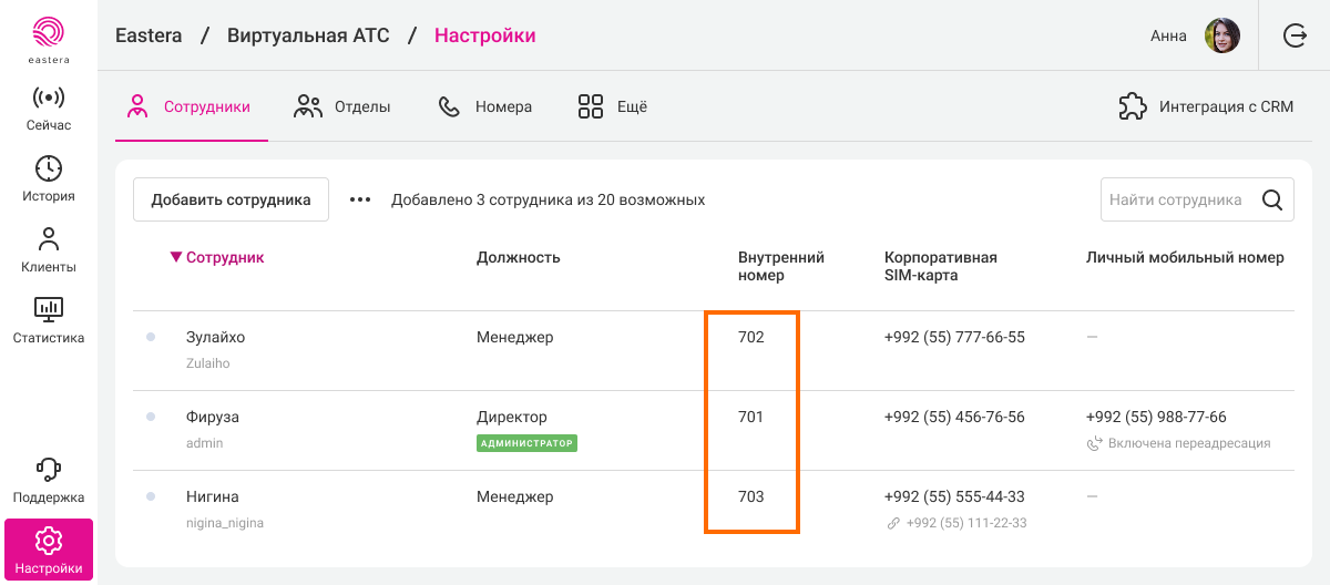 Внутренний номер сотрудника можно посмотреть в списке сотрудников на вкладке «Сотрудник».