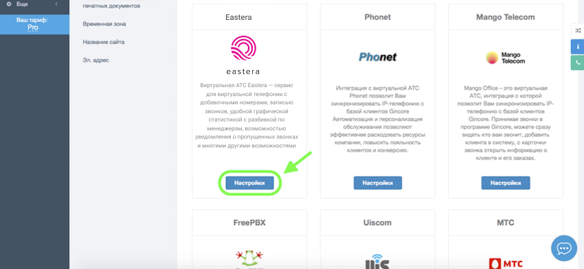 3. Зайдите в Gincore. Выберите «Еще» — «Настройки» — «Интеграция с телефонией». Нажмите кнопку «Настроить» на карточке АТС.