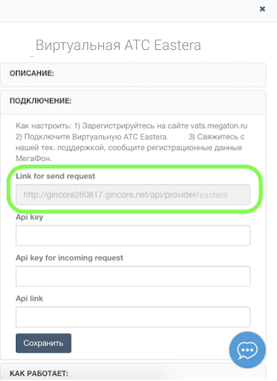 6. Вставьте скопированное значение в АТС в поле «Адрес вашей CRM». Нажмите «Сохранить».