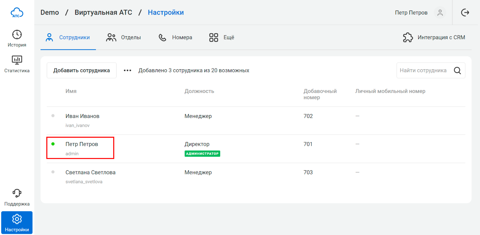 В настройках Виртуальной АТС напротив имени сотрудника появится слово зеленый кружок. Это означает, что устройство подключено.