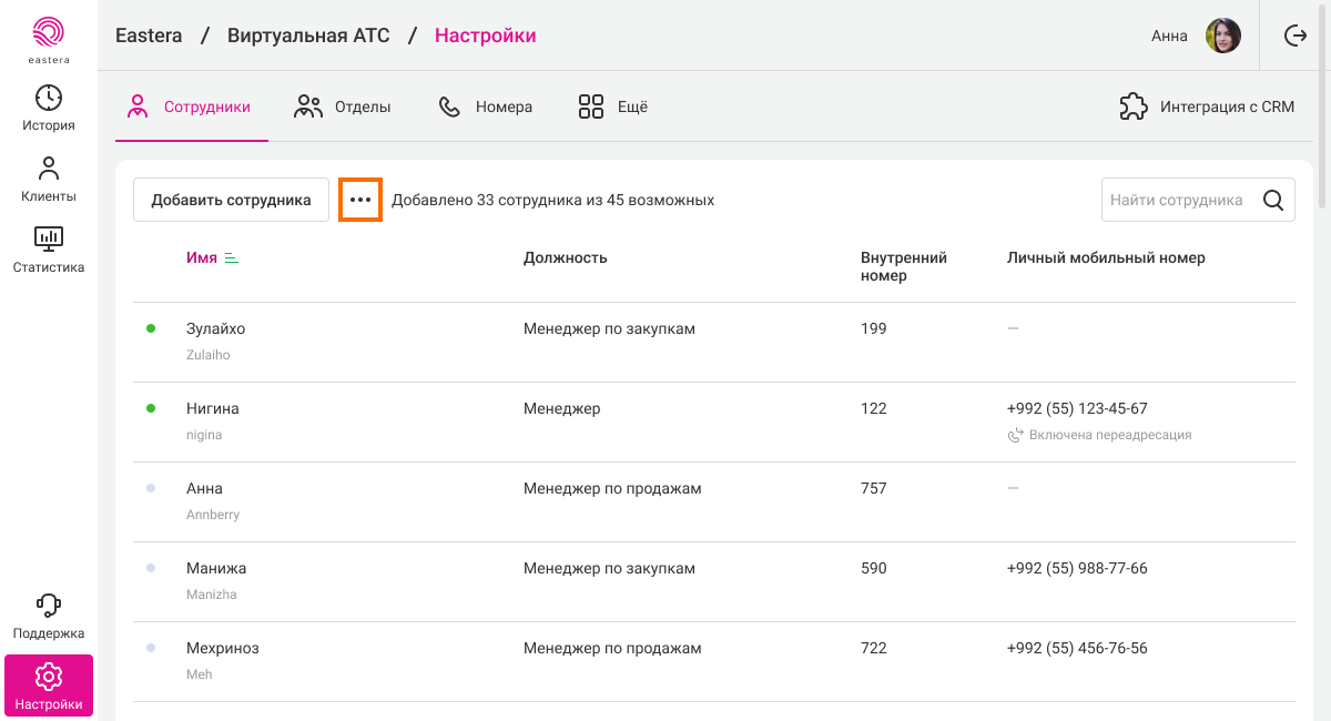• массово создать или отредактировать сотрудников. Если вам нужно добавить ваши номера, изучите раздел «Номера».