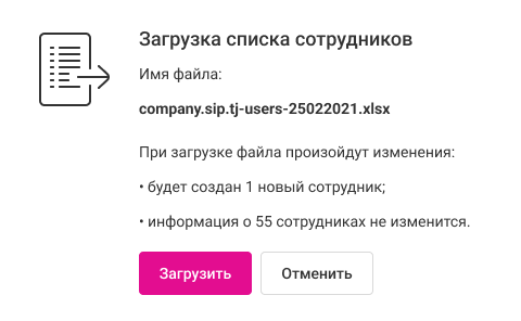 Вернитесь в интерфейс АТС и загрузите файл. Если система обнаружит какие-то ошибки, она сообщит вам об этом. Подтвердите создание или изменение сотрудников, кликнув на кнопку «Загрузить».