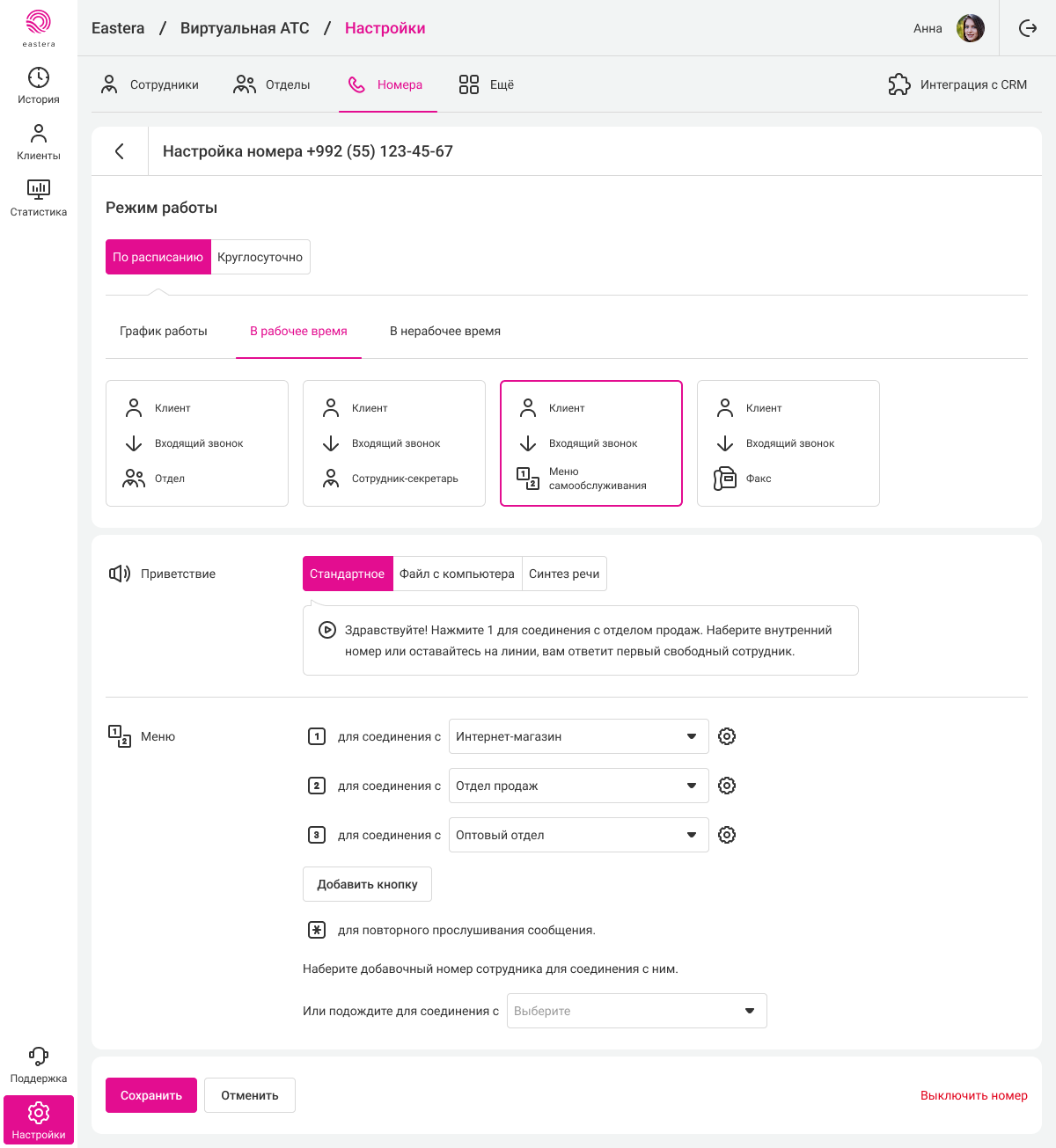 Голосовое меню настраивается отдельно для каждого номера. Перейдите в раздел «Номера» и выберите номер, на котором хотите настроить голосовое меню. Затем выберите режим работы номера и направьте входящие звонки на «Меню самообслуживания».
