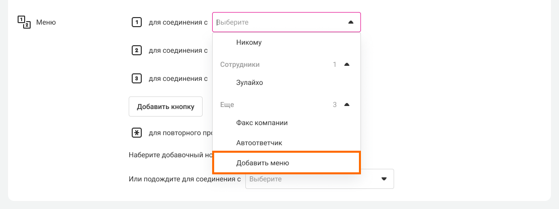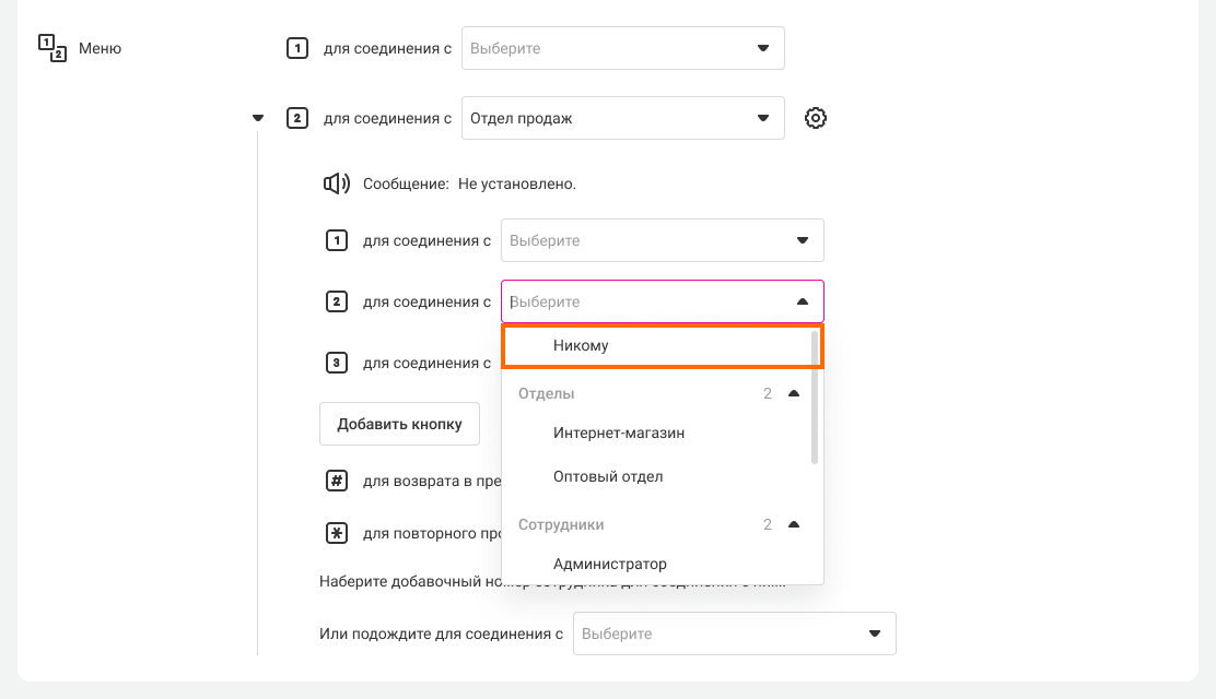 2. Таким же образом выберите, каким отделам или сотрудникам будет поступать звонок при нажатии цифр 2 и 3.