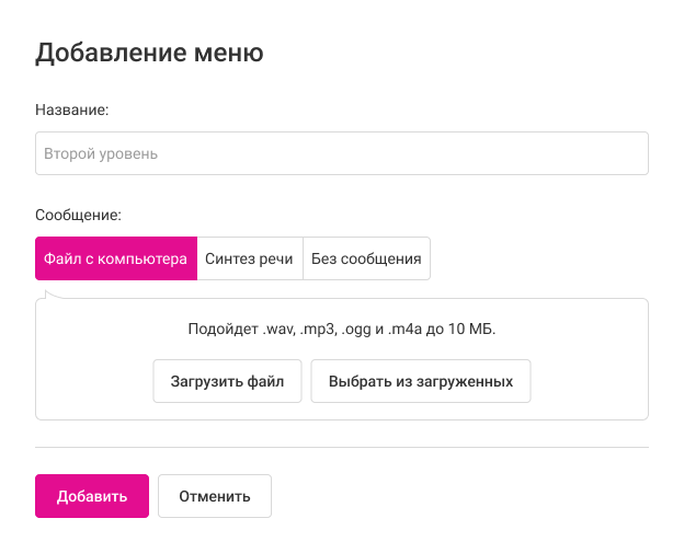 4. Голосовое приветствие настраивается отдельно для каждого уровня меню. Выберите приветствие для второго уровня меню и нажмите «Добавить».
