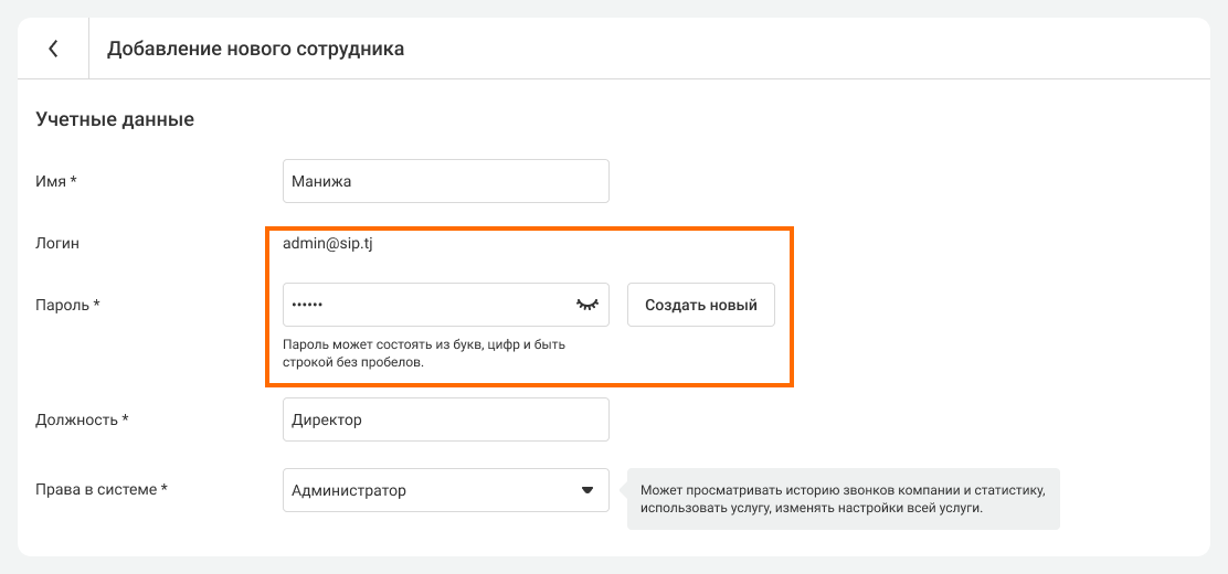 4. Перейдите в раздел «Сотрудники». Далее добавьте сотрудников. Логин и пароль необходимо сохранить для дальнейшей настройки в MasProject.
