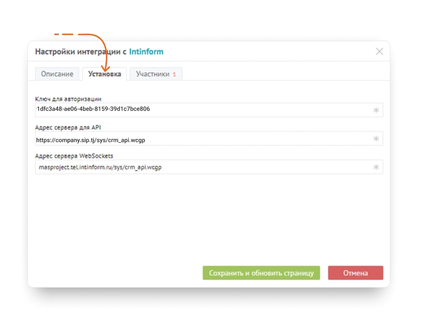 6. В разделе «Установка» укажите «Ключ для авторизации» — вставьте скопированное из ВАТС значение.