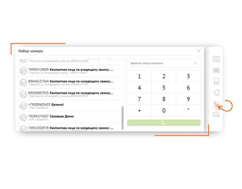 7. После сохранения настроек телефонии, в правом меню появится трубка, при клике на которую вы сможете вызвать список всех контактных лиц.