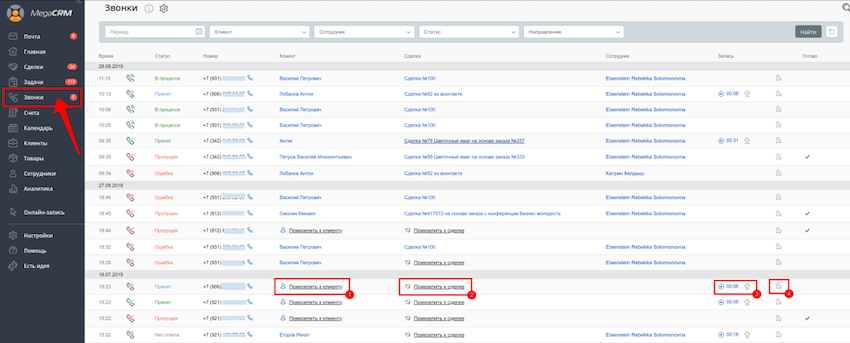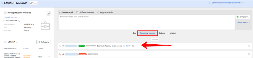 Здесь можно привязывать звонок к клиенту, сделке или создавать задачи из звонка, а также прослушать и скачать запись звонка.