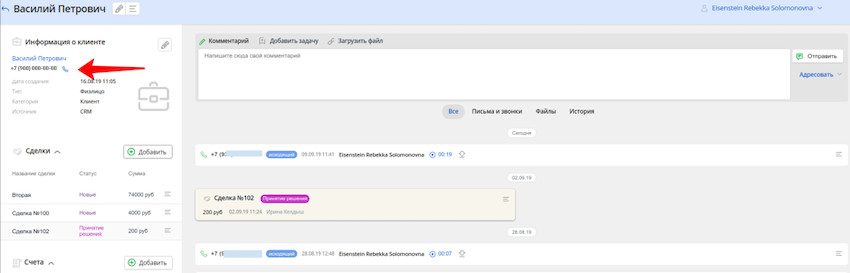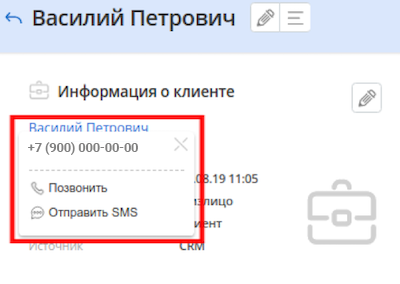 Кликните в CRM на телефонную трубку рядом с номером клиента. Звонок сначала поступит на ваше устройство, а затем клиенту.
