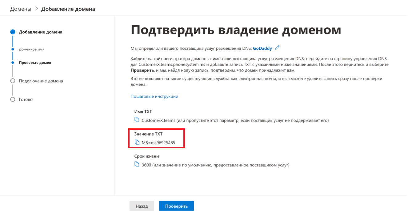 5. В открывшемся окне скопируйте “Значение TXT” вида MS=ms96925485 и вышлите его вашему менеджеру.