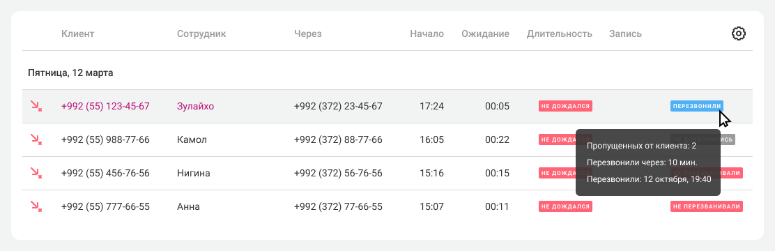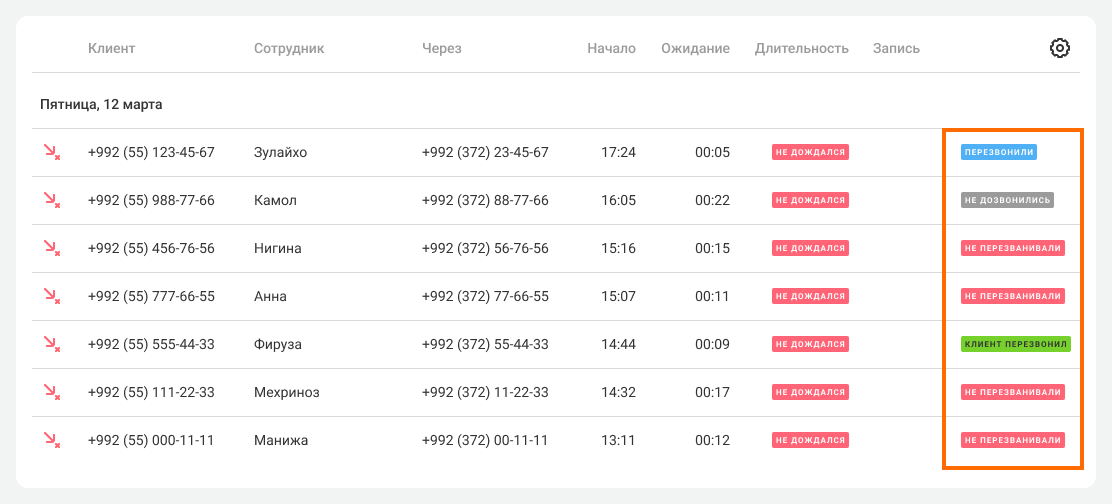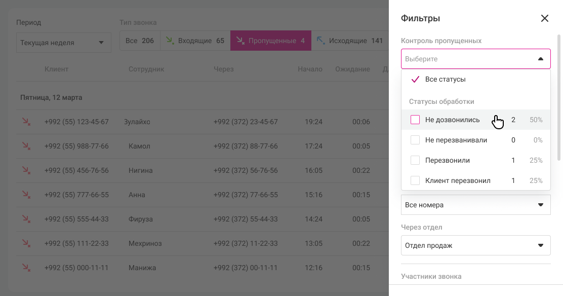 • Контроль пропущенных. Сортируйте непринятые звонки по статусам обработки.