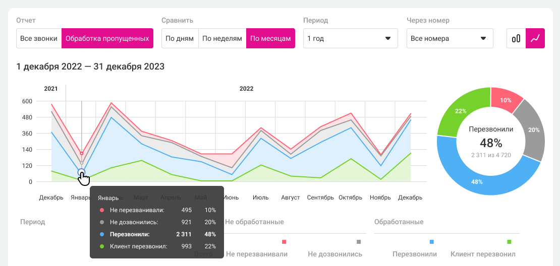 Благодаря визуализации данных, вы сможете оценить, как меняется соотношение обработанных и необработанных пропущенных за выбранный период и организовать активность менеджеров так, чтобы они эффективнее работали во время различных форс-мажоров.