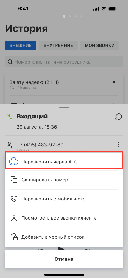 Клиенту можно позвонить из записи о совершенном звонке в «Истории», из карточки звонка или push-уведомления о пропущенном. Расскажем подробнее о каждом из способов.