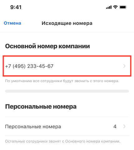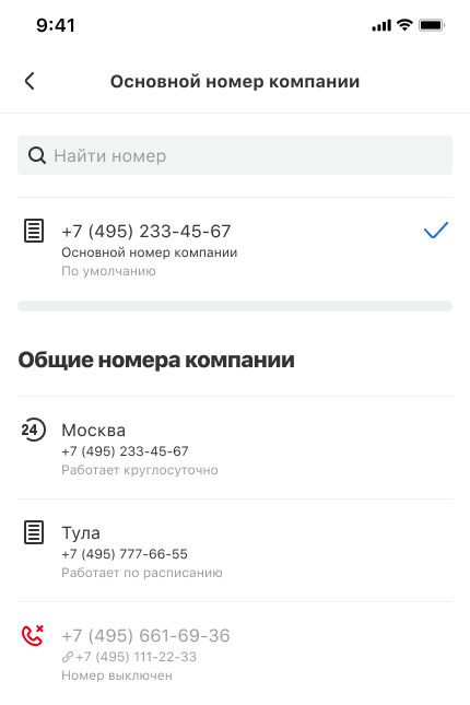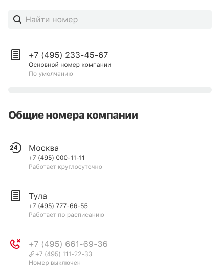 • Общего номера компании — с него будут звонить сотрудники и отделы, у которых нет персональных или региональных номеров.