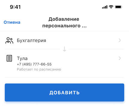 Откроется список настроенных персональных номеров. Нажмите «Добавить», чтобы выбрать персональный номер для сотрудника или отдела.