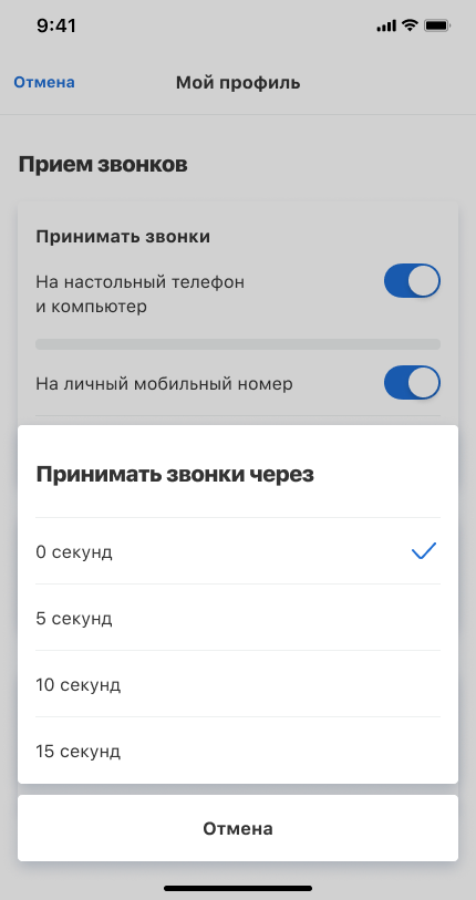 Если сотрудник чаще находится на рабочем месте и сразу может ответить с настольного телефона или компьютера, рекомендуем настроить задержку перед переадресацией звонка мобильный. Так, звонок сначала поступит на офисные устройства, а лишь затем на личный мобильный номер. Под нужным способом приема звонков нажмите «Принимать звонки через» и выберите комфортную задержку для переадресации.