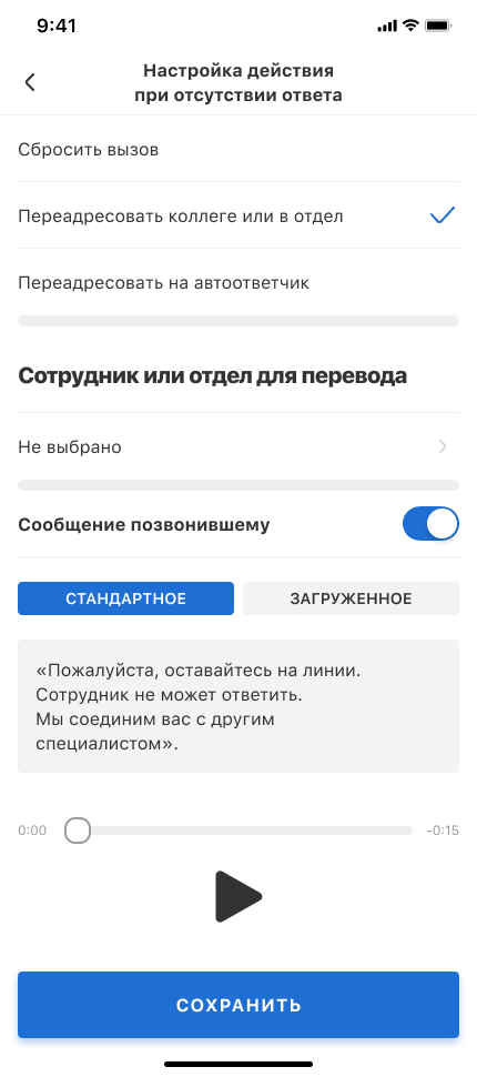 • Переадресовать на автоответчик — чтобы прямые звонки сотрудникам не оставались без ответа, можно переадресовать их на автоответчик.
