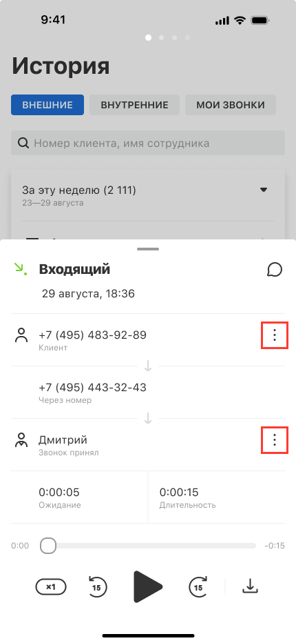 Чтобы перезвонить из карточки звонка, нажмите на нужную запись в «Истории». В карточке звонка нажмите на три точки в правом верхнем углу.