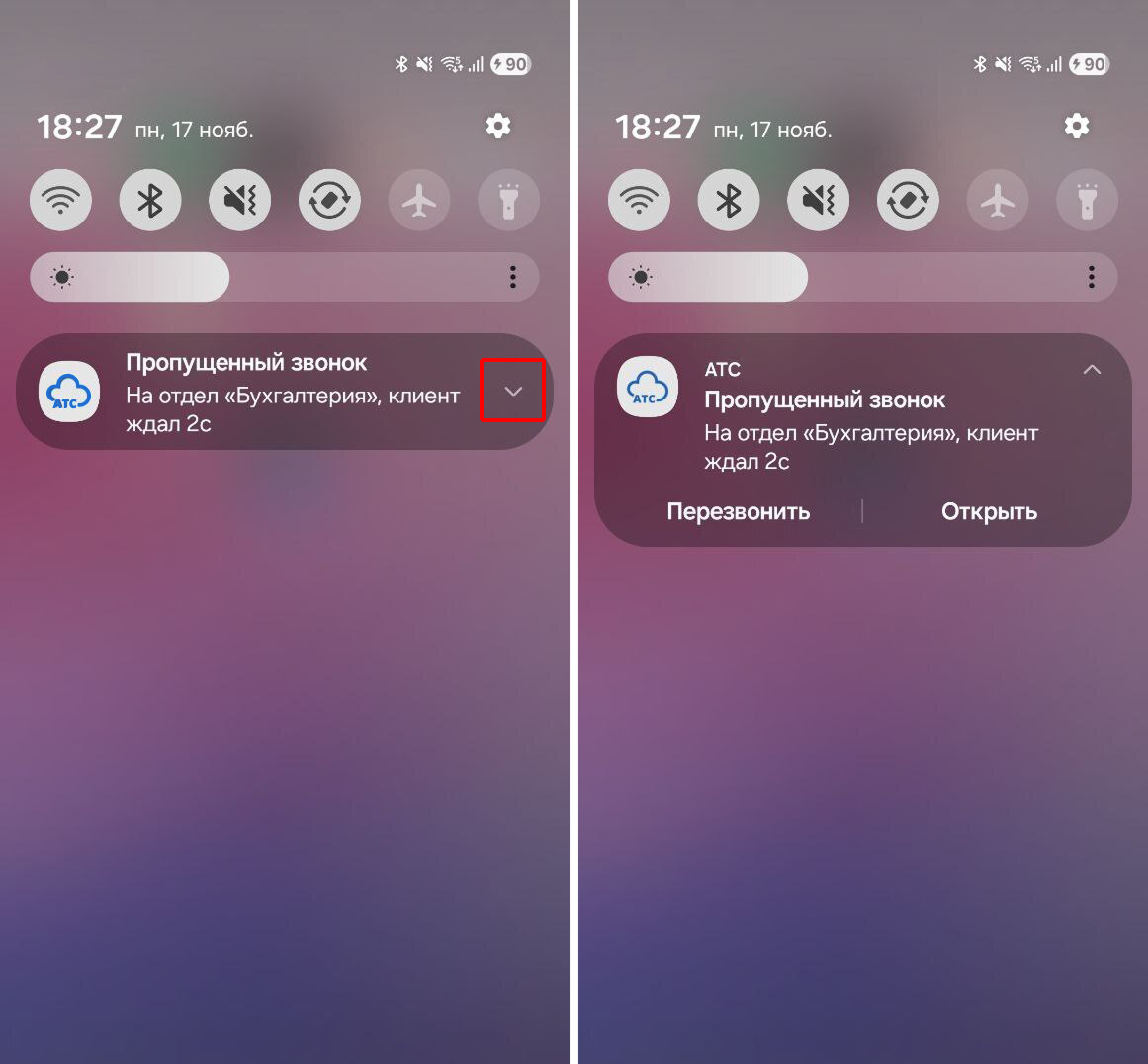 • Для Android нажмите на стрелочку в правой части уведомления. Чтобы мгновенно начать звонок, выберите «Перезвонить». Пункт «Открыть» открывает карточку звонка.