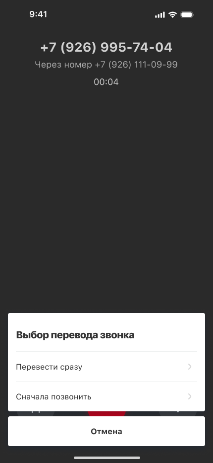 • сотрудник оставляет клиента ждать на линии и звонит коллеге, на которого собирается перевести звонок. Таким образом сотрудник может быстро ввести коллегу в курс дела или узнать доступен ли тот сейчас для звонка и только затем подтвердить перевод.