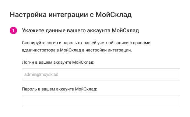 В открывшемся окне настройки интеграции укажите логин и пароль от вашего аккаунта администратора в МойСклад.