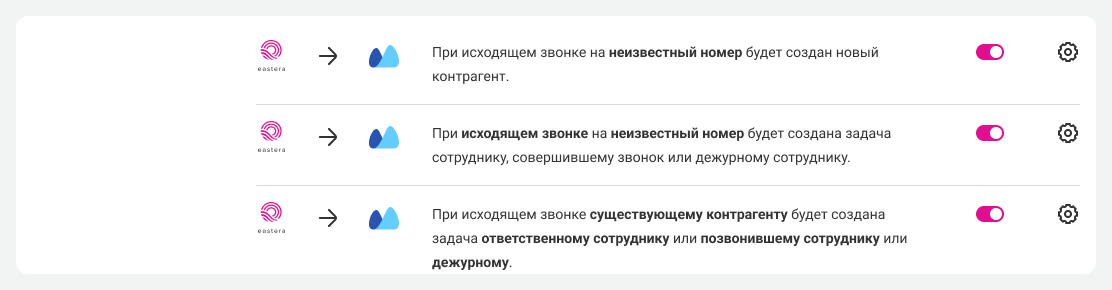 • после звонка с участием неизвестного номера (успешного и неуспешного, входящего и исходящего) могут быть автоматически созданы новый контрагент и задача на сотрудника;
