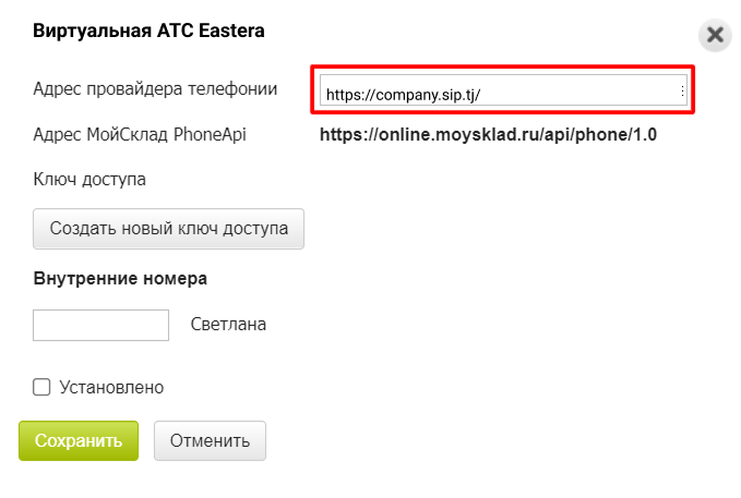 4. В поле «Адрес провайдера телефонии» вставьте адрес вашей Виртуальной АТС, скопированный на шаге 2.