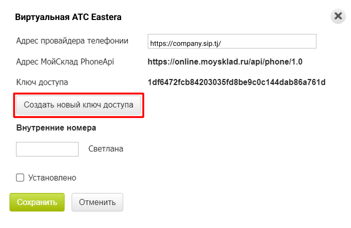 6. Вернитесь в интерфейс Виртуальной АТС и в поле «Ключ доступа» вставьте скопированный ключ.