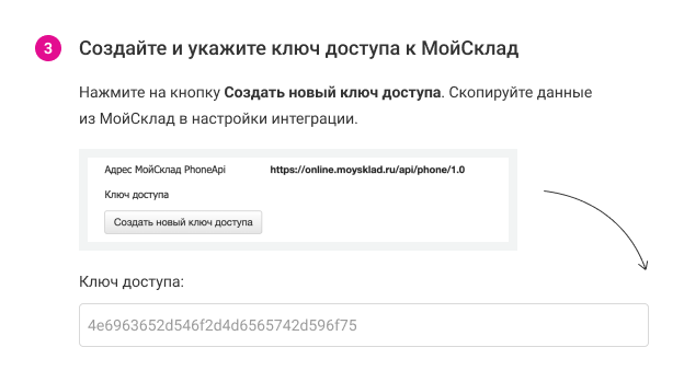 5. Нажмите кнопку «Создать новый ключ доступа» (даже если сервис МойСклад предложил вам готовый ключ). Скопируйте вновь сгенерированный код доступа.