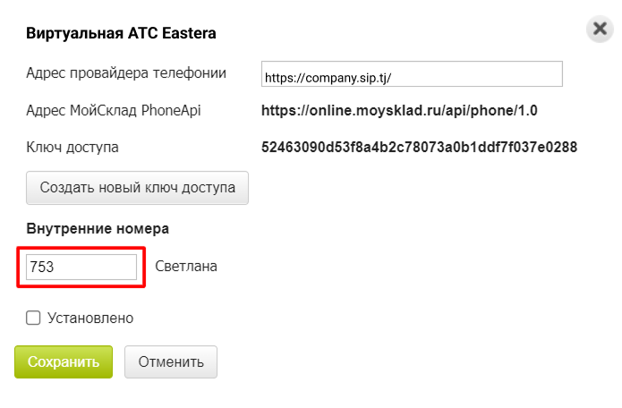 8. Поставьте «галочку» напротив «Установлено» и нажмите «Сохранить». Убедитесь, что в карточке приложения «МойСклад Phone API» появилась надпись «Установлено».