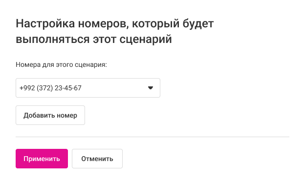 Если ваша компания использует несколько номеров, вы можете указать в настройках, на каких номерах будет работать интеграция с МойСклад. Для этого в разделе «Настроенные сценарии интеграции» нажмите кнопку «Добавить сценарий».
