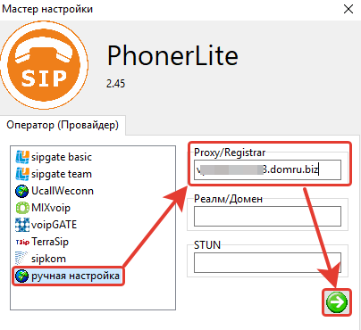 2. Появляется новое окно настройки -в нем выбираем “Ручная настройка”, заполняем “Proxy/Registrar” (указываем адреса нашей ОАТС), нажимаем Далее.
