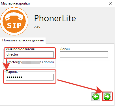 3. Вводим “Имя пользователя” и “Пароль” (копируем их из настроек ОАТС - Сотрудники - Имя сотрудника, “Логин” - ту часть, что до @, копируем в “Имя пользователя”, “Пароль” в “Пароль”), нажимаем Далее.