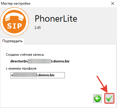 Если данные введены корректно, увидим успешную регистрацию (зеленая пиктограмма)