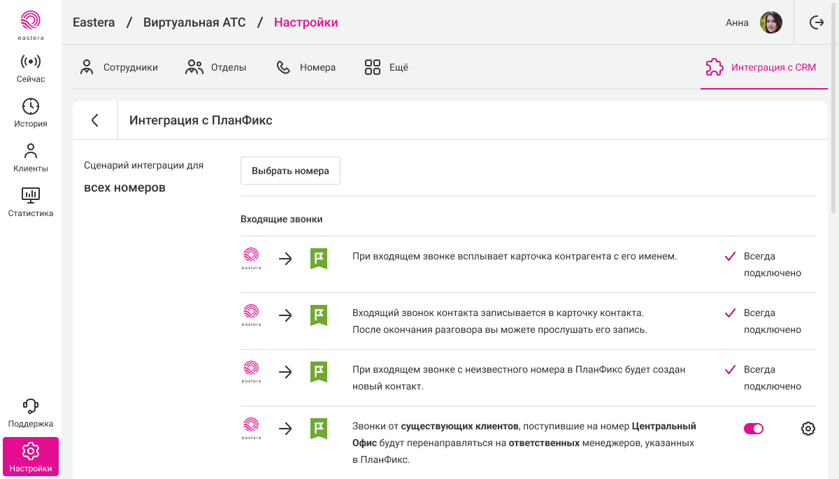 Если вы хотите, чтобы при звонке на номер вашей компании клиент не терял времени на первой линии или IVR и сразу соединялся со своим персональным менеджером, включите данную опцию в настройке интеграции в интерфейсе Виртуальной АТС.