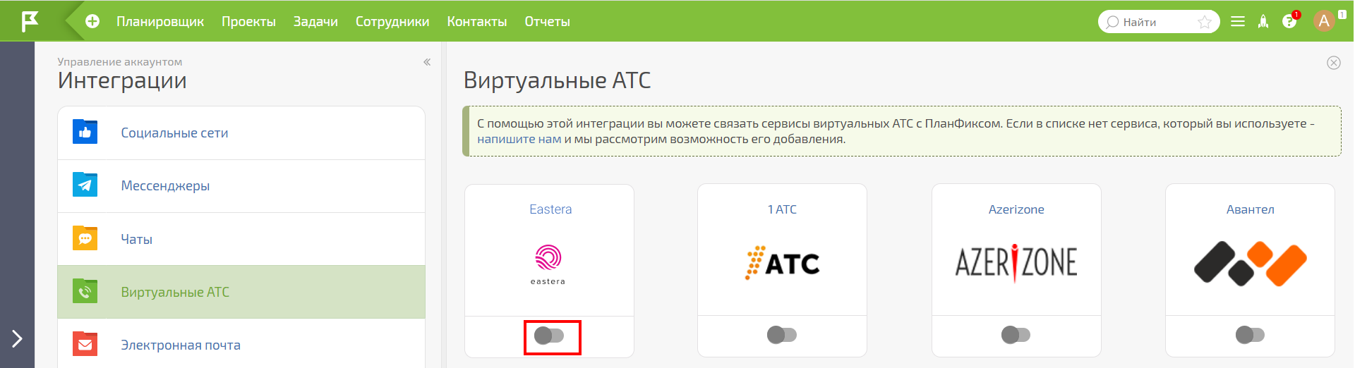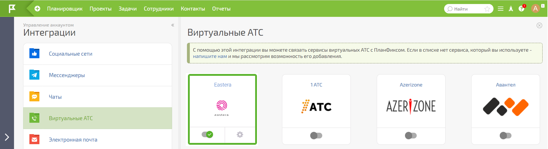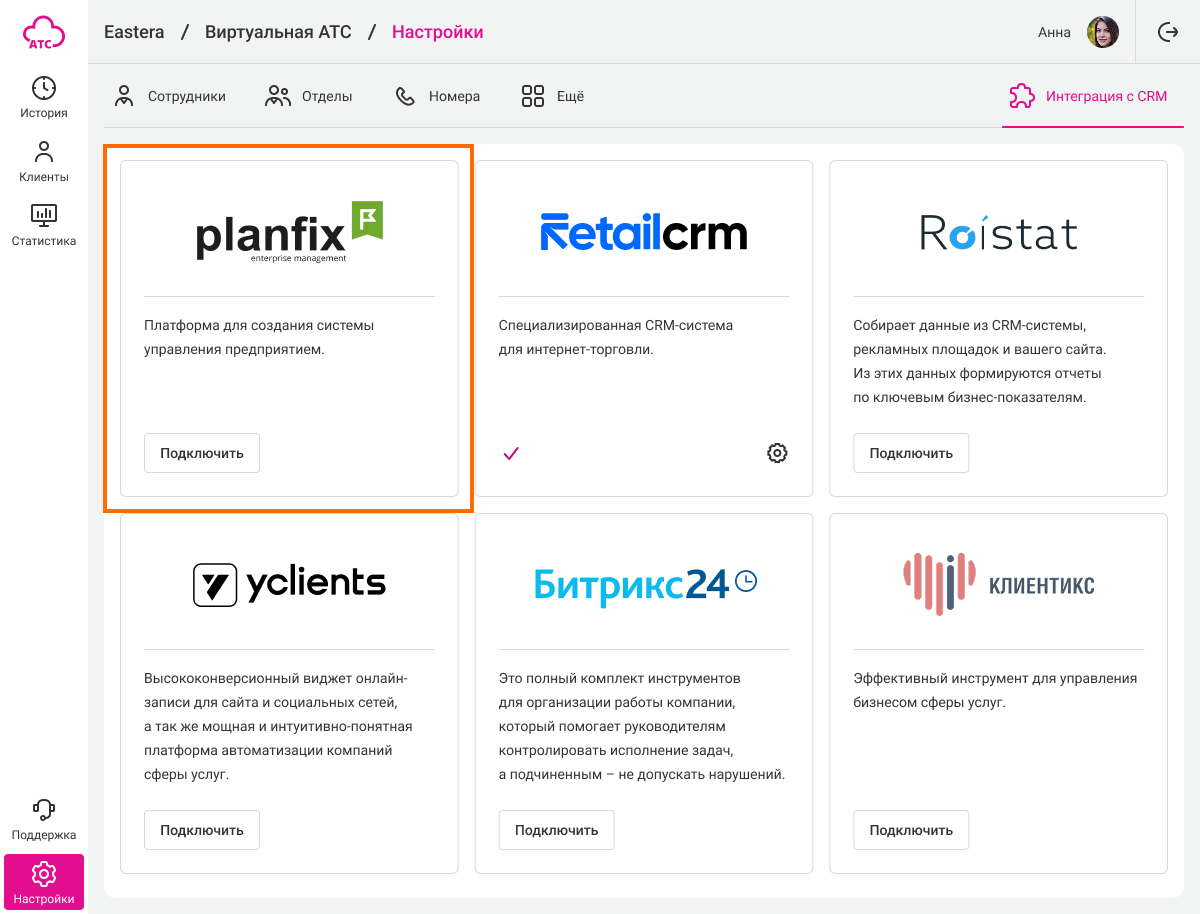 Скопируйте токен телефонии и перейдите в АТС. В разделе «Настройки» в правом верхнем углу выберите «Интеграция с CRM». В списке CRM-систем найдите ПланФикс и нажмите «Подключить».