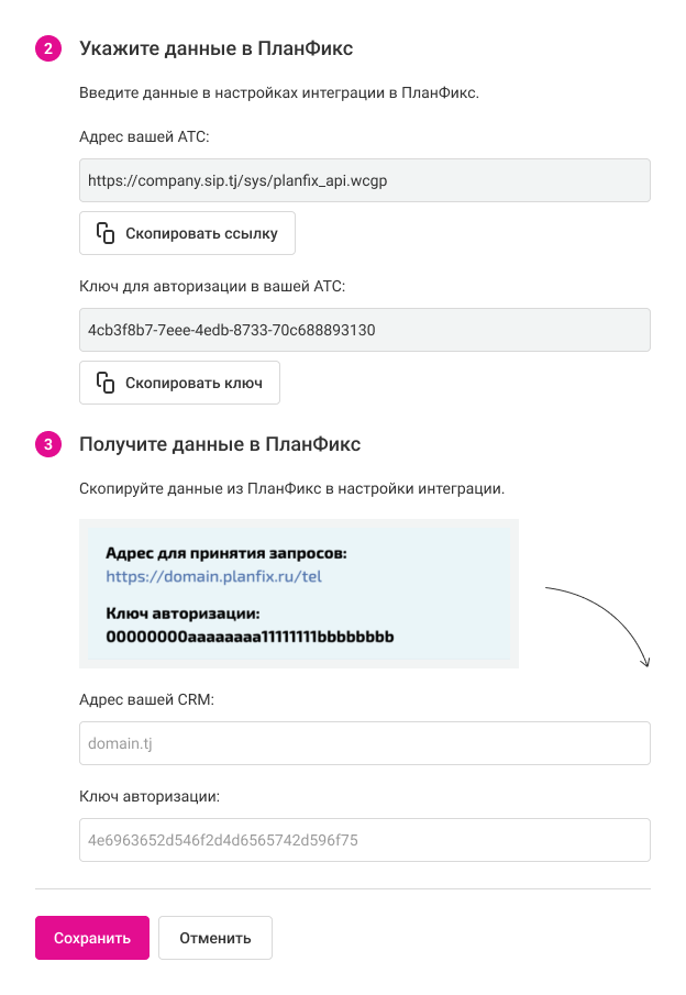 Скопируйте адрес вашей АТС, вставьте его в поле «Адрес АТС» в ПланФикс. То же самое для ключа авторизации: скопируйте его в ПланФикс и вставьте в настройках интеграции.