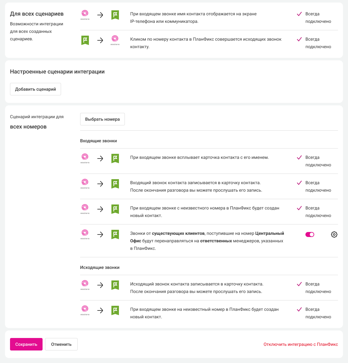 - Как изменять список номеров в сценариях интеграции, чтобы настраивать для выбранных номеров сценарии интеграции, отличающиеся от основного сценария.