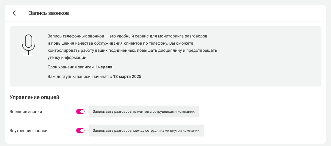 Вы можете временно отключить запись звонков, если это требуется для особенного случая. Обратите внимание, что выключение записи в этом разделе не останавливает тарификацию, а позволяет лишь на время выключить её. Если вы хотите отключить запись насовсем, отключите её в разделе «Тариф».