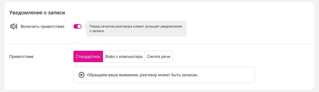 Даже при исходящих звонках ваш клиент и ваш сотрудник услышат предупреждение о записи. По умолчанию Виртуальная АТС будет проигрывать стандартное сообщение, но вы в любой момент можете заменить его на свой файл с компьютера или озвучить текст уведомления о записи с помощью функции «Синтез речи».