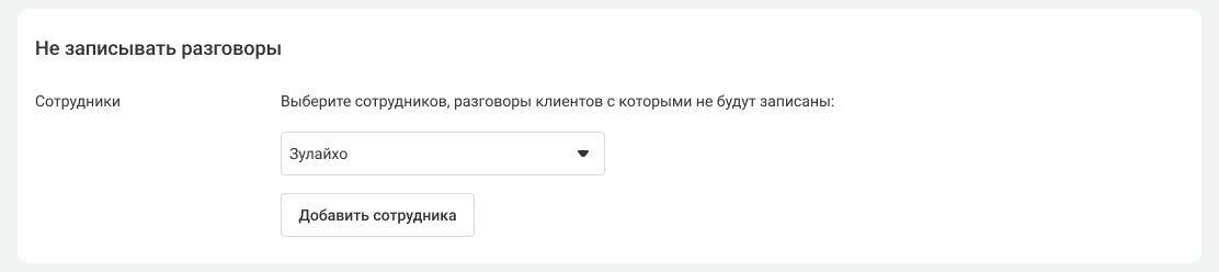 - Если во время одного звонка клиента разговаривало несколько сотрудников, в том числе сотрудник с запретом записи, то не запишется весь звонок.