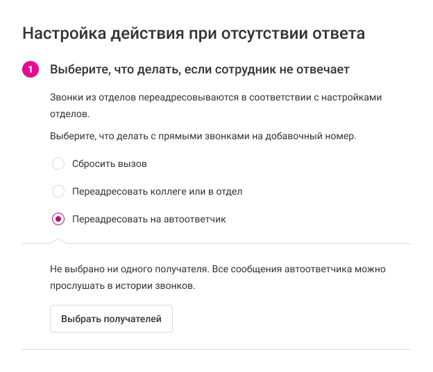 Подробнее о настройках получателей автоответчика читайте в статье «Голосовая почта (автоответчик)» в разделе «Автоответчик сотрудника».