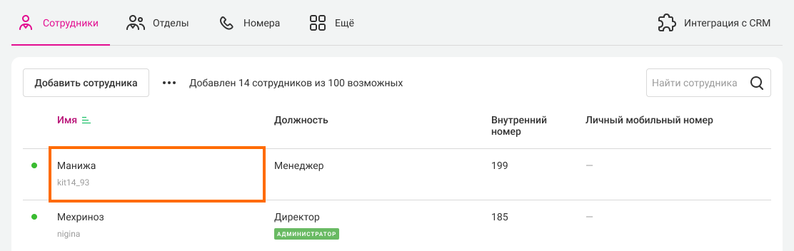 Если номер телефона сотрудника не зарегистрирован в сети, например, выключен или находится вне зоны доступа, вызов клиента будет также переадресован.1. Перейдите на вкладку Сотрудники. Нажмите на имя сотрудника, для которого хотите настроить переадресацию.