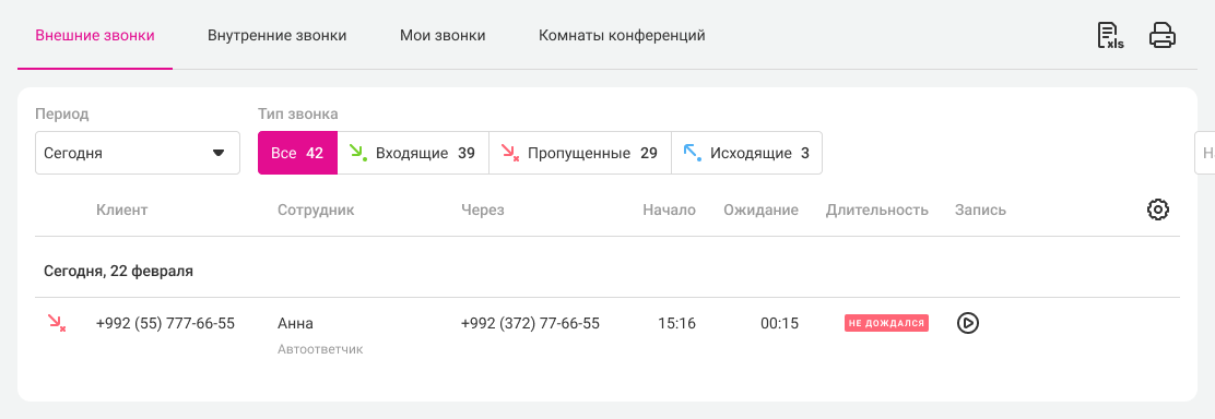 - если клиент оставил сообщение – как пропущенный сотрудником с подписью «Автоответчик» (в столбце «Сотрудник»).