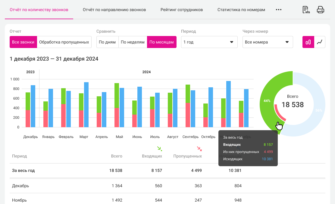 • сколько звонков приняли или пропустили сотрудники на каждом из отмеченных номеров за выбранный период;